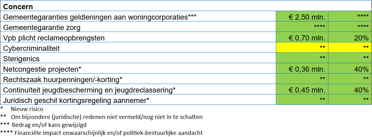 In principe worden risico’s met een score van 1 niet of nauwelijks meegewogen, maar soms kan het toch belangrijk zijn deze separaat zichtbaar te maken. Bijvoorbeeld vanwege de financiële impact of politiek-bestuurlijke aandacht.
