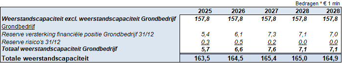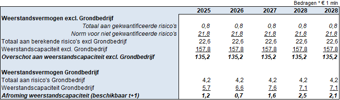 Bij de berekening en beoordeling van het weerstandsvermogen wordt onderscheid gemaakt tussen het concern (exclusief grondzaken) en grondzaken. De tabel geeft de opbouw van de weerstandscapaciteit van deze onderdelen weer.