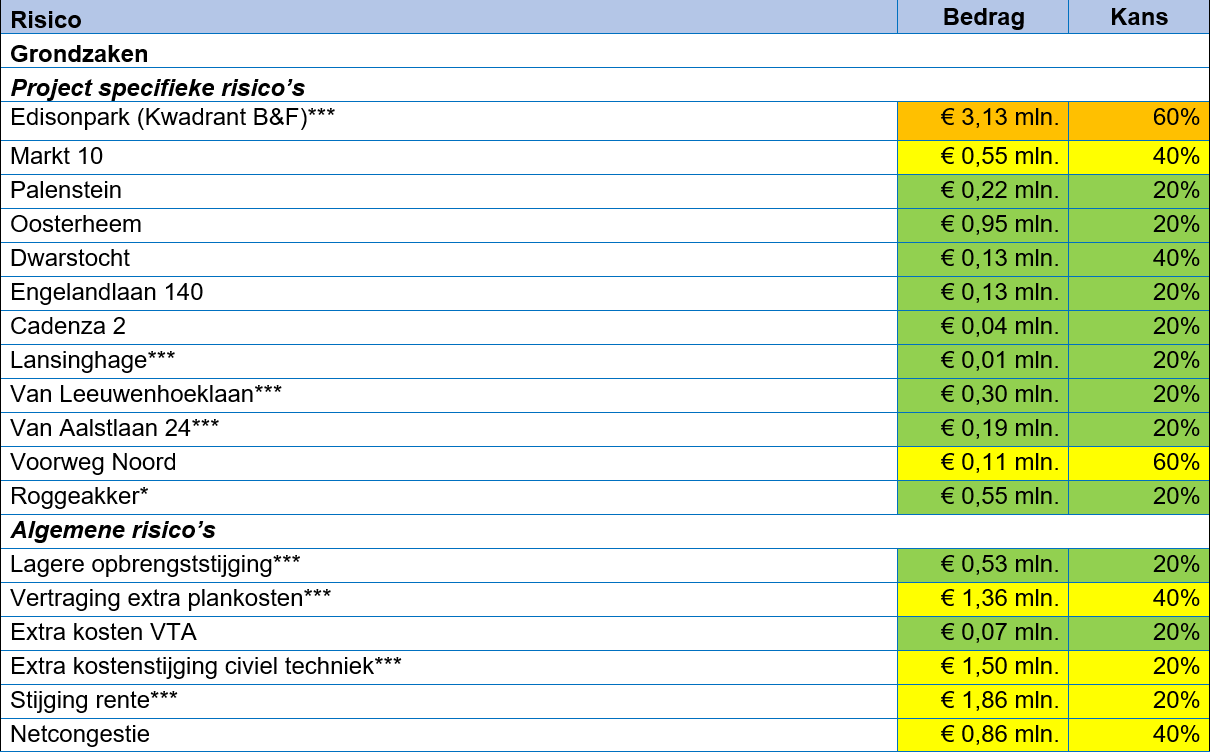 Het berekende risico van de algemene - en projectspecifieke risico’s bij grondzaken bedraagt afgerond € 4,2 mln. waarvoor weerstandscapaciteit wordt gevormd. Bij het overige concern is dat € 0,82  mln.