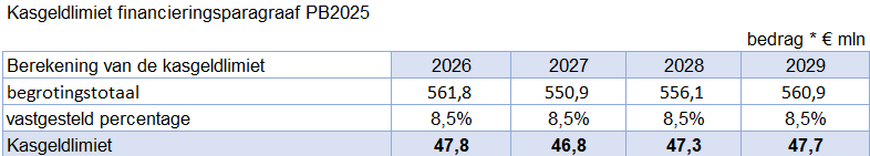 Om te zorgen dat een gemeente niet direct in de problemen komt wanneer de rentetarieven stijgen, mag een gemeente niet alleen leningen hebben met een looptijd van korter dan een jaar. Een rentestijging zou er dan toe kunnen leiden dat een gemeente direct in de financiële problemen komt. Daarom is er een limiet gesteld aan het aantal kortlopende leningen dat een gemeente mag hebben en dit wordt de kasgeldlimiet genoemd. De kasgeldlimiet geeft voor de gemeente de maximaal toegestane omvang van de kortlopende schuld (met looptijd korter dan één jaar) aan. Er mag 8,5% van het begrotingstotaal met kortlopende leningen worden gefinancierd. Dit is voor 2026 een bedrag aan kortlopende leningen van maximaal € 47,8 mln.