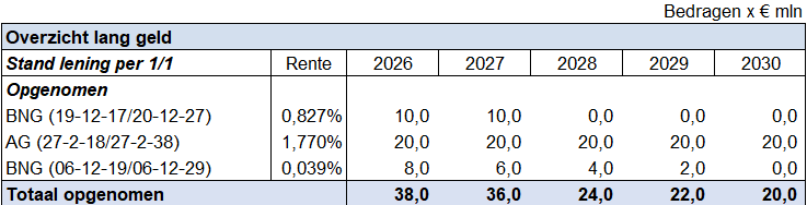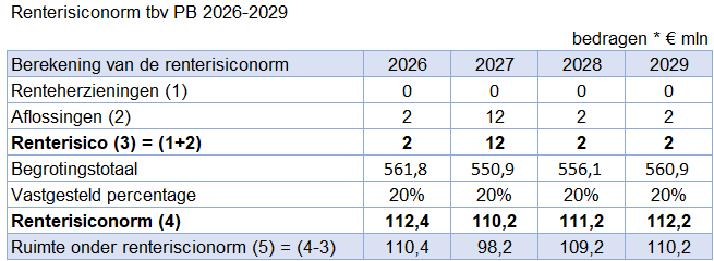 Het renterisico op het lange geld wordt bewaakt via de renterisiconorm. Deze norm wil zeggen dat de jaarlijkse aflossing plus renteherzieningen van de lening portefeuille maximaal 20% van het begrotingstotaal mag zijn. Hiermee wordt voorkomen dat een gemeente in financiële problemen komt op het moment dat de rente snel stijgt. Voor 2026 geeft de renterisiconorm aan dat de gemeente Zoetermeer maximaal voor € 112,4 mln. aan aflossingen en of renteherzieningen mag doen. Zoals zichtbaar in de tabel vindt er geen herziening plaats en vindt er voor € 2,0 mln. aan aflossingen plaats. Hiermee wordt ruimschoots aan de norm voldaan.